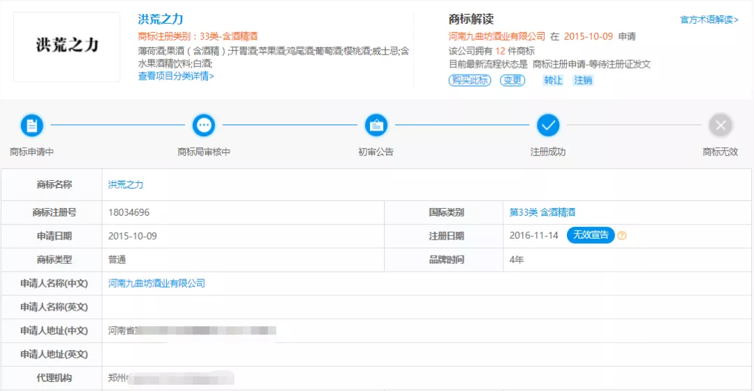 2015年10月,俞春永受到热播剧《花千骨》的启示,将剧中新词 “洪荒之力”注册成为商标,1年后,商标局核准注册,河南九曲坊酒业有限公司申请“洪荒之力”商标33类成功,俞春永终于拿到了商标证书!